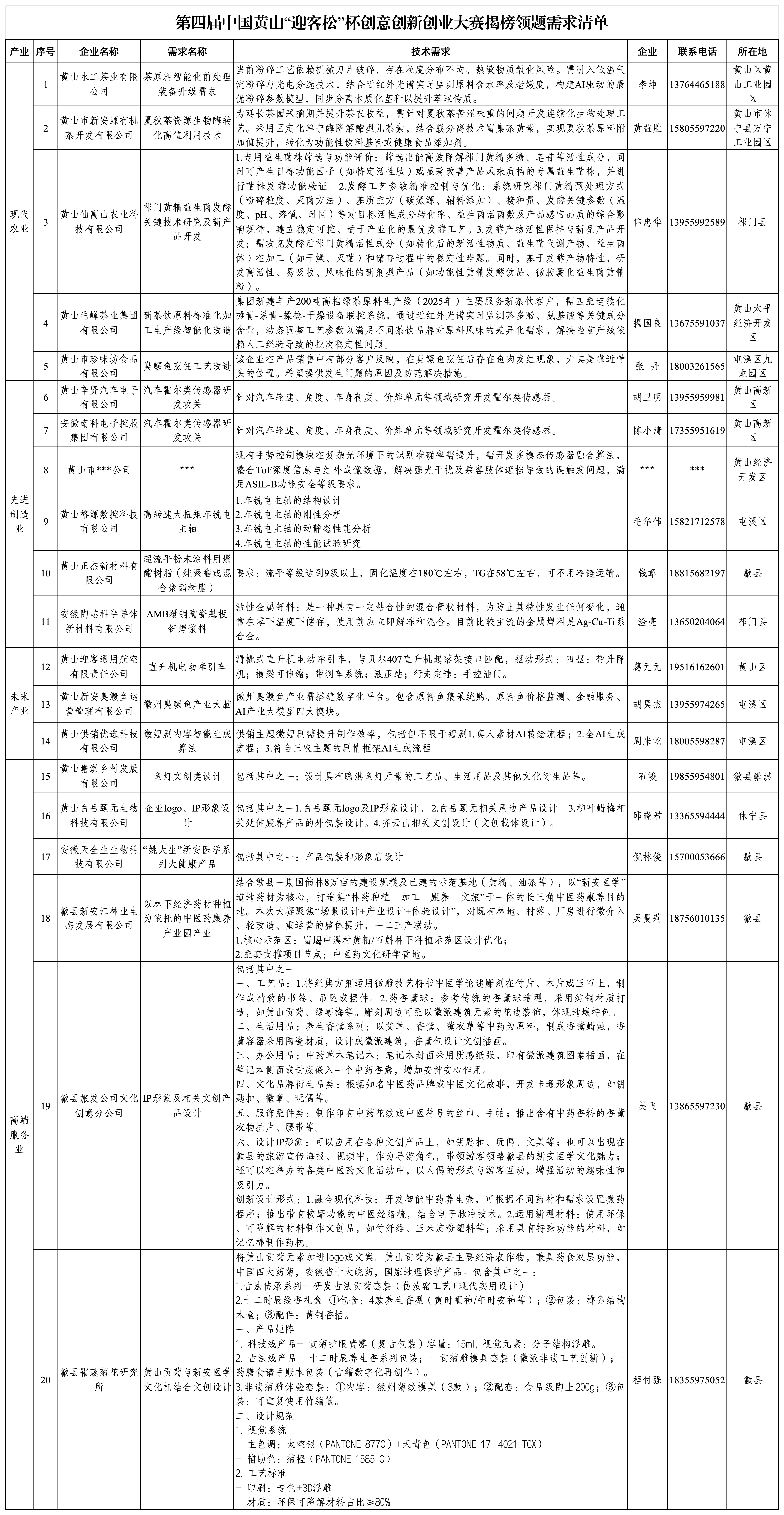 | 高端服务业专项赛 | 旅游文创产品设计:以“徽州有礼”为主题,需包含徽州文化、黄山景点、黄山美食等元素,例如徽州三雕、徽州漆器、鱼灯、汉服等;中医药康养文创产品及文化产业设计:包括但不限于设计具有中医药康养元素的工艺品、生活用品、办公用品、产品包装及其他文化衍生品等,新安医学文化品牌logo、IP形象等;对黄山市城乡、村庄、街道的闲置空间提出融合中医药康养文化特点的改造方案等。 |
